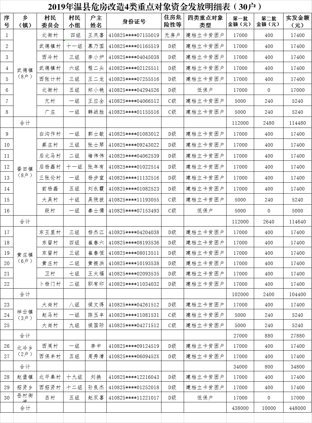 2019年(nian)温县危房改造(zao)4类重(zhong)点对象資(zi)金髮(fa)放明细表(30戶(hu))